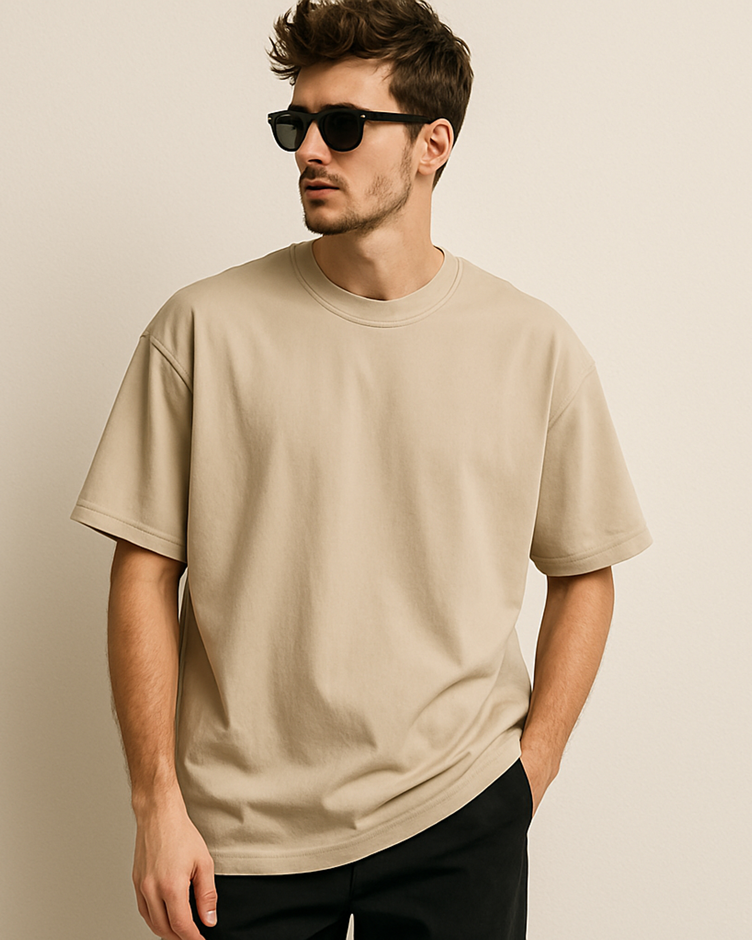 A warm, versatile beige tee in a relaxed, street‑ready silhouette that drapes effortlessly. The oversized cut, drop shoulders, and soft cotton knit deliver everyday comfort with minimalist style.